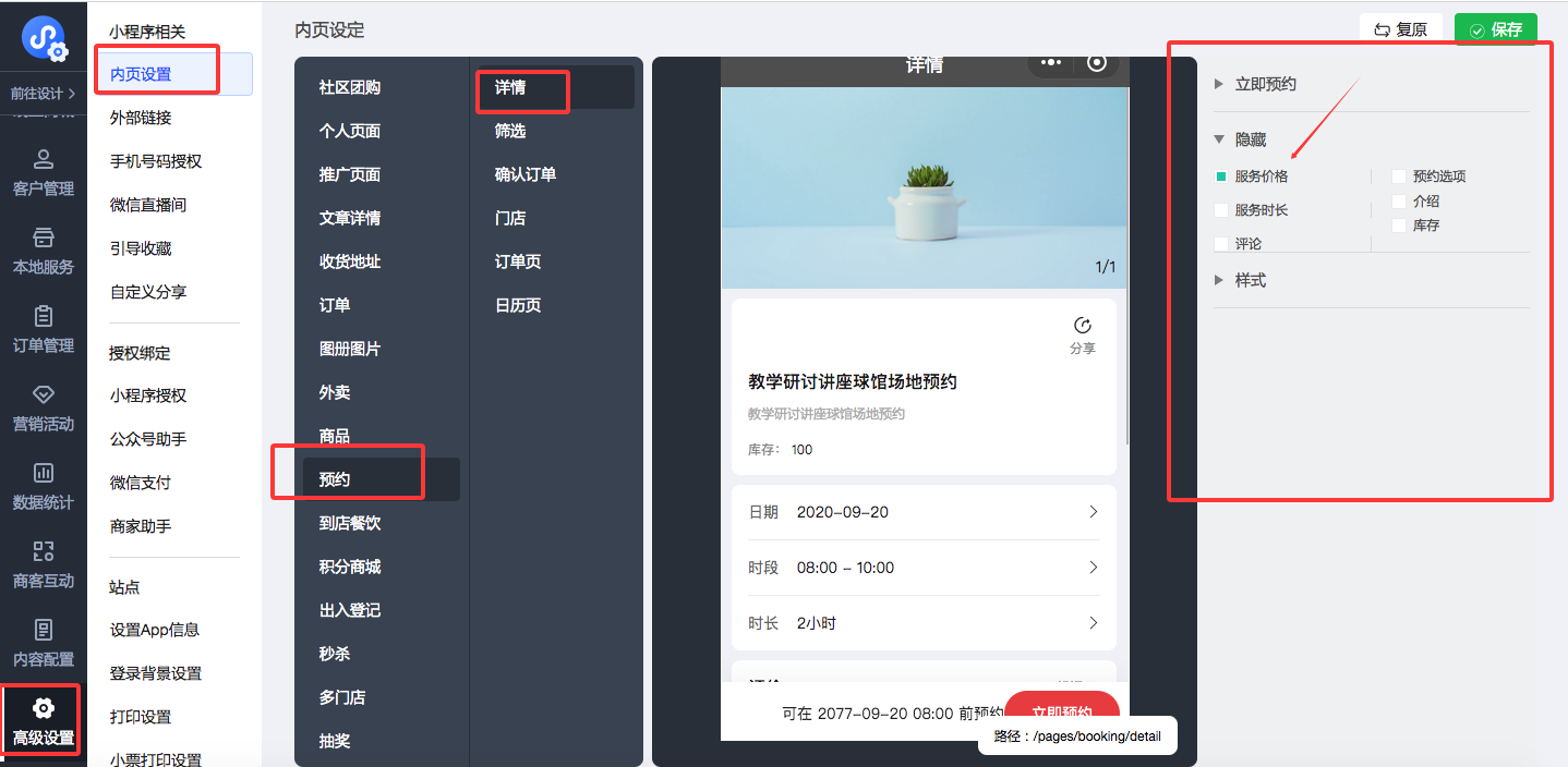 1、微信小程序产品: 优化预约组件内页设置,增加组件的服务价格隐藏设置。