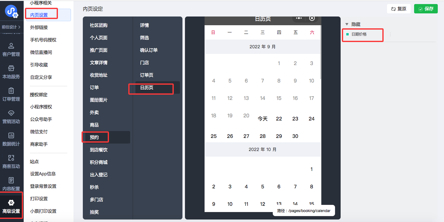 2、微信小程序产品: 优化预约组件内页设置,增加日历隐藏价格设置。