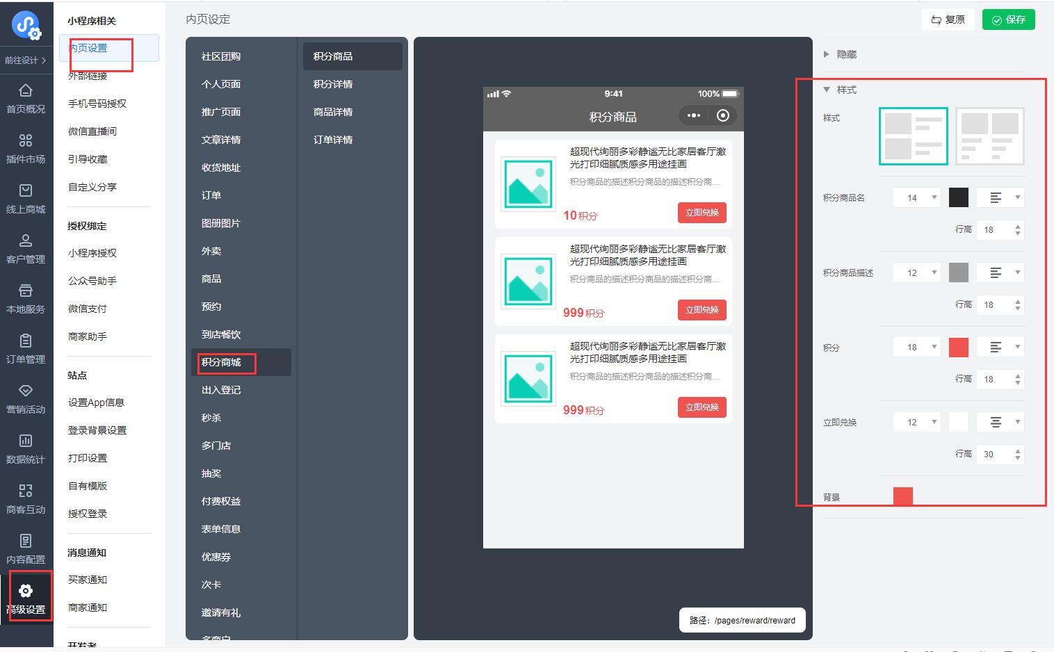 2、微信小程序产品: 优化积分商城内页设计,增加样式选项。