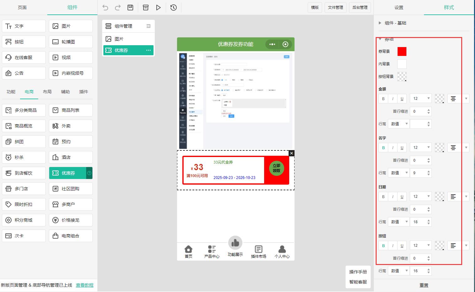1、微信小程序产品: 优化优惠券组件,增加券项设置。
