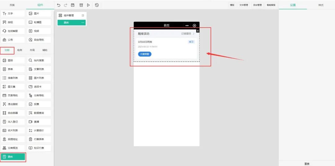 第六步选择完题目并保存然后返回小程序设计页面把对应的组件拖拉即可
