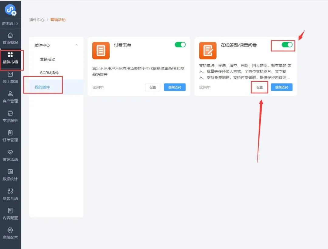 第一步:登陆小程序管理后台--插件中心--试用--设置